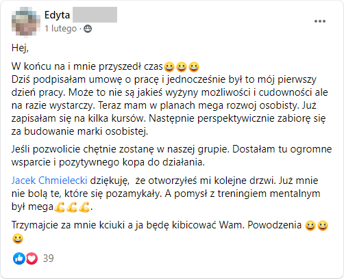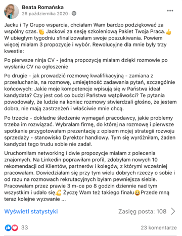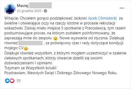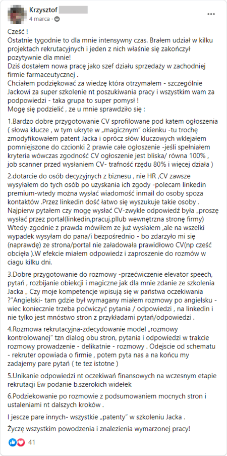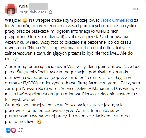 w nasze sprawy, za stworzenie tej świetnej społeczności osób wspierających się wzajemnie w tym trudnym procesie poszukiwania pracy 🙂"
