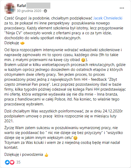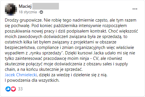 "Dzięki kursowi Jacka udało mi się nie tylko zainteresować pracodawcę moim ninja - CV, ale również skutecznie połączyć moje doświadczenia z obszaru sales i supply chain, a na końcu skutecznie je sprzedać. Jacek Chmielecki, dzięki za wiedzę i dzielenie się z nią!"
